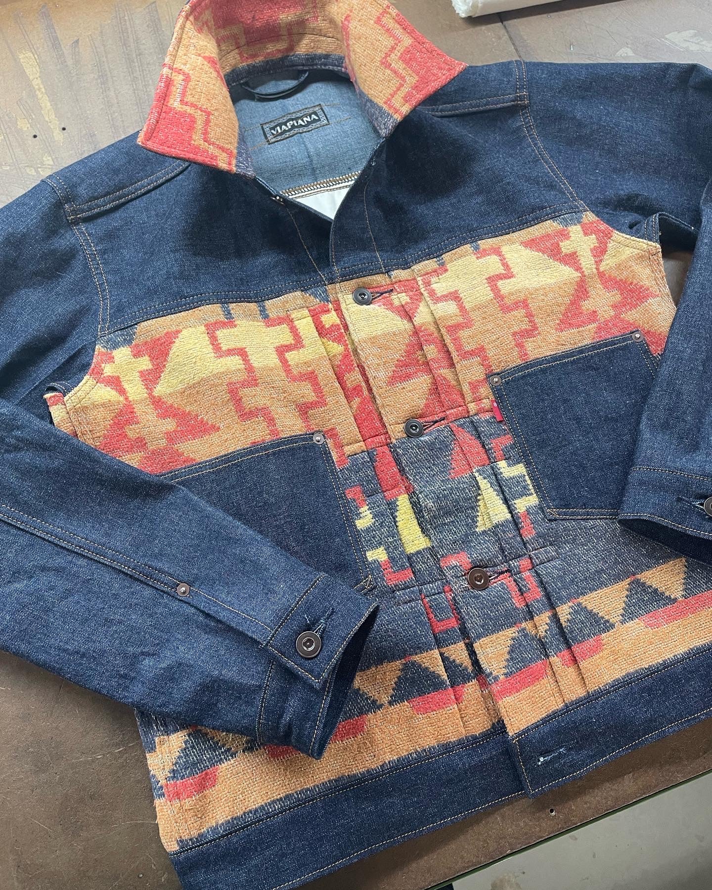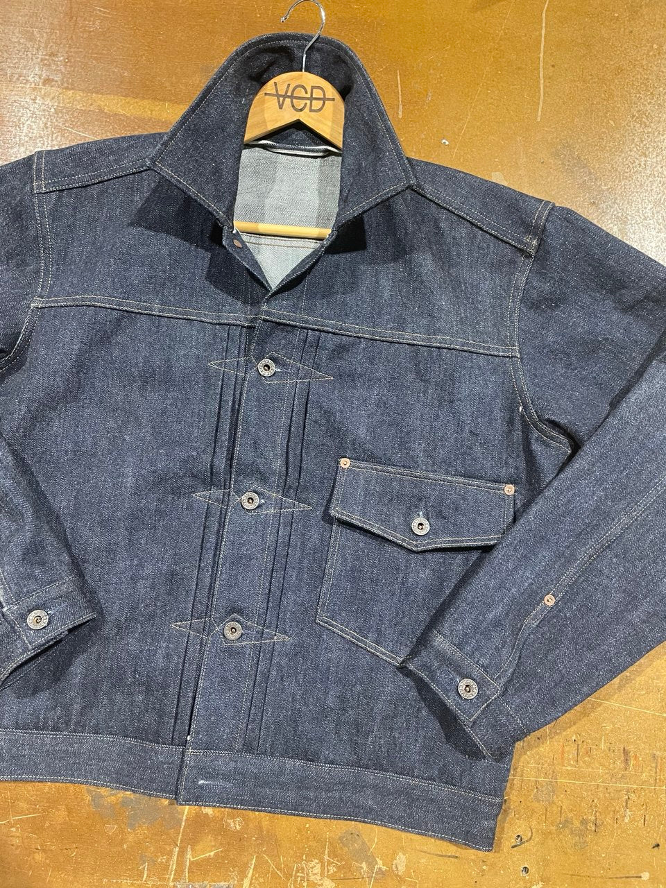 This jacket is made with a Japanese selvage denim fabric that was woven to replicate the WWII style material. As opposed to the classic "repro", this jacket is sewn with a brown cotton/poly corespun thread to give it a more muted look.